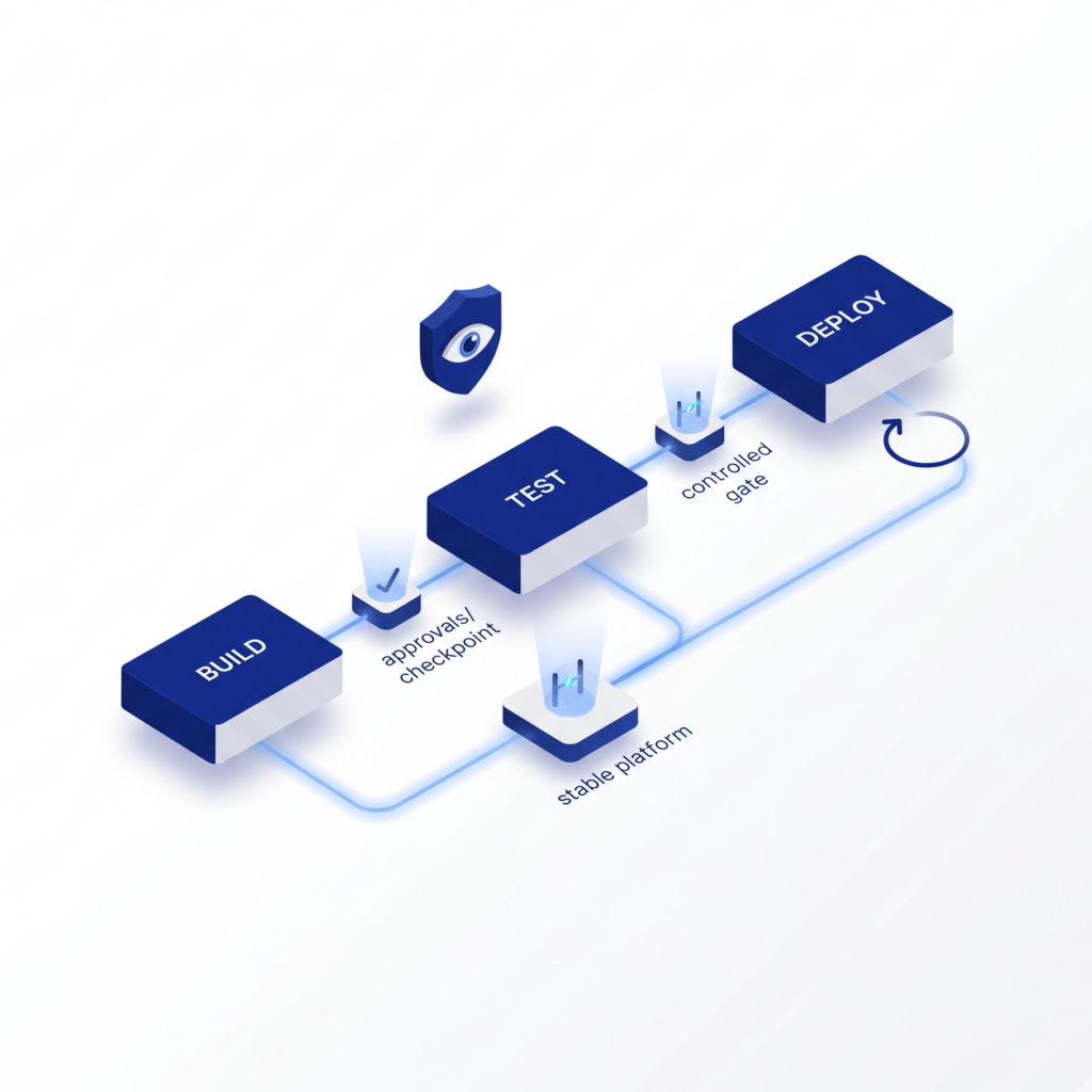 Governance mechanisms are also integrated into CI/CD pipelines to maintain deployment reliability and compliance. Engineers configure approval workflows, automated rollback systems, and release management policies that allow organizations to control deployments while maintaining rapid release cycles across development environments.